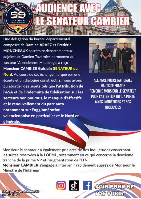 AUDIENCE AVEC LE SENATEUR CAMBIER DU NORD, LE MI REPOND En mai dernier, ALLIANCE Police Nationale lors d’une audience avec le sénateur GAMBIER évoquait plusieurs sujets dont celui de L’ASA, des secteurs non pourvus par l’indemnité de fidélisation... Publication : 17 juillet 2025 Lire la suite... Nord, Bureau Régional, Hauts de France